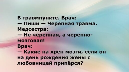 02:091,0×00:00/02:09В травмпункте. Врач: - Пиши - Черепная травма Медсестра: - Не черепная, а черепно- мозговая! Врач: - Какие.. Анекдоты7910 смотрели · 4 года назад