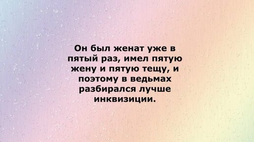 02:191,0×00:00/02:19Он был женат уже в пятый раз, имел пятую жену и пятую тещу, и поэтому в ведьмах разбирался лучше.. Анекдоты4 года назад