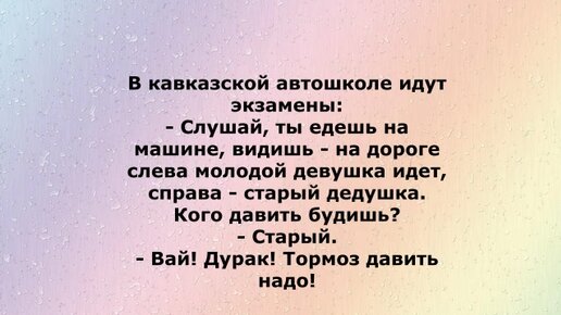 02:191,0×00:00/02:19В кавказской автошколе идут экзамены: - Слушай, ты едешь на машине, видишь - на дороге слева молодая.. Анекдоты249 смотрели · 4 года назад