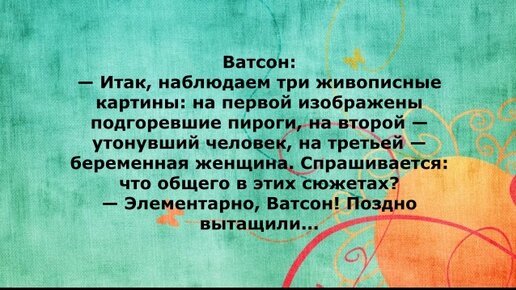 02:161,0×00:00/02:16Ватсон: - Итак, наблюдаем три живописные картины: на первой изображены подгоревшие пироги, на второй.. Анекдоты14,8 тыс смотрели · 4 года назад