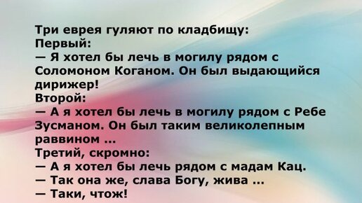 02:091,0×00:00/02:09Три еврея гуляют по кладбищу: Первый: - Я хотел бы лечь в могилу рядом с Соломоном Коганом. Он был.. Анекдоты43,2 тыс смотрели · 4 года назад