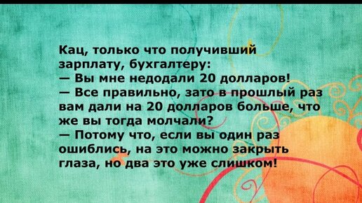 02:161,0×00:00/02:16Кац, только что получивший зарплату, бухгалтеру: - Вы мне недодали 20 долларов! - Все правильно, зато в прошлый.. Анекдоты11,5 тыс смотрели · 4 года назад