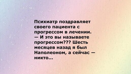 02:191,0×00:00/02:19Психиатр поздравляет своего пациента с прогрессом в лечении. - И это вы называете прогрессом? Шесть месяцев.. Анекдоты123 смотрели · 4 года назад