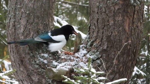 Пасмурным туманным утром у леса меня ждала большая синица, за мной наблюдали сорока и сойка. Подавал голос большой пестрый дятел. Четыре сойки и сорока Я пришла к месту, где кормлю птиц. Едва я успела высыпать на землю нарезанные кусочки хлеба, арахис и чуть-чуть отойти, как подлетели к корму три сойки и сорока. Когда сорока выбирала арахис, сойки наблюдали за ней и ждали своей очереди. Сойки подавали голоса, одна из них отгоняла других соек. Подлетела четвертая сойка. Бойкие птицы приступили разбирать кусочки хлеба...
