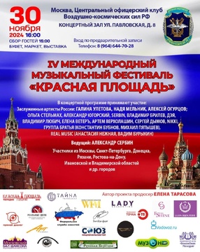 29 ноября 2025 в городе Москве пройдет V Международный Музыкальный фестиваль "Красная площадь 2025" в Центральном офицерском клубе Воздушно-космических сил РФ. Главная тема фестиваля - любовь к Родине!