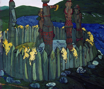 В. М. Васнецов оставляет на картине один путь для Ильи Муромца: «Как пряму ехати — живу не бывати…»! Слова «живу не бывати» указывают на сферу небытия, к которой ведет прямая дорога, и которую иногда путают со смертью! Смерть – неизбежный удел любого живого существа, смерть не может напугать былинного русского богатыря. Куда более страшное пространство – небытия жизни! Небытие начинается с исчезновения культурного смысла, прямо как на картине – разбросанные, непогребенные кости, указывающие на забвение праха, поросшие мхом древние заветы... Богатырская сила необходима, чтобы заботой о родной земле возродить духовное величие народа, расчистить пространство от паутины разбойников-бесов. Илья Муромец не размышляет, по какому пути направить своего коня (движения: «налево» и «направо» – традиции не русского благочестия), он прочитывает высеченный на камне текст, стараясь понять причину искушения той «культурной руки», что вывела предложение трех дорог в направлении русской судьбы!