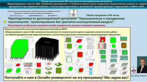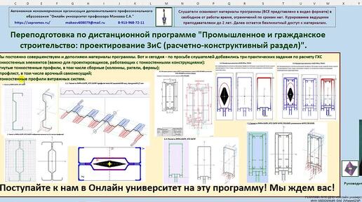 Онлайн университет проф. Макеева С. А. продолжает набор на программу профессиональной переподготовки https://sopromex.ru/переподготовка/ Дистанционная форма программы переподготовки "Промышленное и гражданское строительство: проектирование (расчетно-конструктивный раздел)" включает 548 часов обучения В чем уникальность и преимущества программы проф. Макеева С.А.? -Все материалы переподготовки разработаны в качественном видео формате, доступны для скачивания и остаются у слушателей навсегда. -Практические задания, курсовые работы, проекты, (включая ВКР) - всего более 30 заданий, выполняются ручным способом в соответствии с действующими СП с верификацией результатов в ЛИРА-САПР и SCAD Office. -Задания оформляются в виде ПЗ и сдаются на проверку ведущим преподавателям (проходной балл 70 из 100). -При необходимости предоставляется доступ к коммерческим версиям ПК ЛИРА-САПР и SCAD Office (мы являемся представителями этих ПК в регионе). -Экзамены по основным дисциплинам проводятся в виде онлайн собеседования в режиме "вопрос/ответ" по материалам лекций и выполненных практических заданий, или в виде теста. -Возможность общаться с ведущими преподавателями по вопросам лекций, практик, решению профессиональных задач по телефону или онлайн в консультационных вэб-классах.