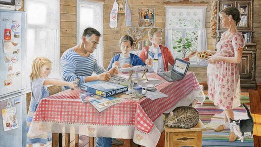 Художник изобразил свой идеал русской семьи: во главе семьи послуживший Родине мужчина, рядом нежная и верная жена и много детей. Чистый и уютный деревенский дом, в котором есть вся необходимая бытовая техника...