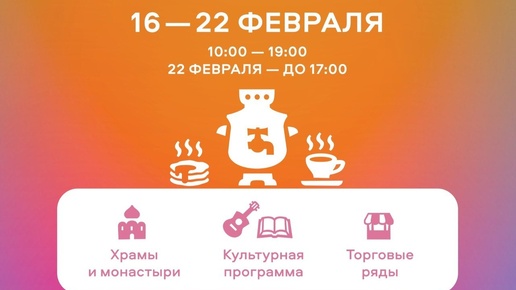» 🥞 По традиции на выставке можно будет приобрести изделия монастырских мастерских, иконы, украшения, текстиль, мед, сладости, чаи, сыры и другие продукты. А ещё будет: ✔️ праздничная программа с блинами и хороводами, ✔️ мастер-классы, подвижные игры и творческие выступления, ✔️ беседы о традициях народов России и встреча с...