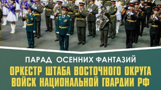 30 октября в 18.30 в Хабаровской краевой Филармонии (Шевченко 7), состоится концерт военного оркестра штаба Восточного округа войск национальной гвардии РФ «Парад осенних фантазий». В программе классические мелодии отечественных и зарубежных композиторов, а также популярные эстрадные песни и композиции...