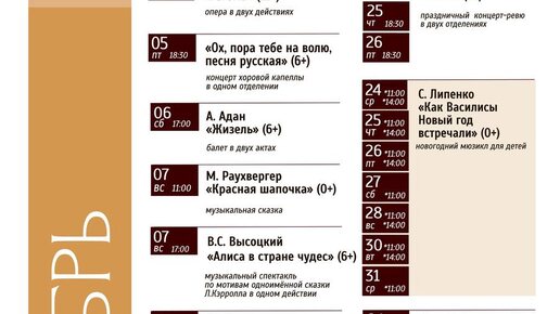 Репертуар на декабрь 2025 г. и январь 2026г. Дорогие зрители!❤️ Представляем вам насыщенную афишу предстоящих мероприятий— в репертуаре театра на ближайшие месяцы уже полюбившиеся публике спектакли и концертные программы, яркий перформанс и спектакли для детей. Всех нас ждет насыщенная программа новогодних мероприятий для аудитории всех возрастов: 🎄праздничный концерт-ревю "С Новым годом -2026!", 🎄мюзикл для детей "Как Василисы Новый год встречали", 🎄самый любимый новогодний балет П...