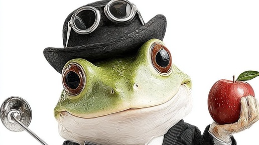 A drawing of a frog holding an apple, wearing a funnel-shaped hat, and riding a scooter