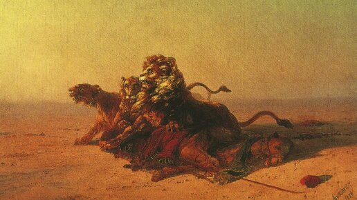 Гривы львов вместо пенящейся волны и пустыня вместо моря – Иван Константинович, вы ли это?! Конечно, среди примерно 6 тысяч картин, написанных Айвазовским, есть такие, где не представлены ни моря, ни реки. Но чтобы прямо пустыня? Где главный русский маринист этого набрался? Предположение о том, что Айвазовский написал львов и пустыню с чужих слов, не было бы оскорблением. Во-первых, ему случалось так поступать. Например, картину «Ледяные горы в Антарктиде» он создал по рассказам своего друга адмирала...