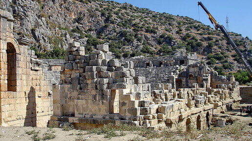 С Ликийскими гробницами соседствует греко-римский театр. Эти достопримечательности построены в разные века, но выглядят как одно целое. Конечно, может показаться удивительным тот факт, что рядом с кладбищем построено развлекательное место...