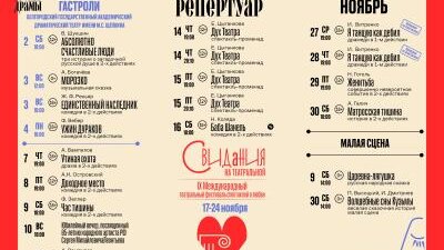 В Рязанском театре драмы сформирована афиша на ноябрь. В программе со 2 по 4 ноября «Большие гастроли» Белгородского государственного академического драматического театра имени Михаила Щепкина. В репертуаре белгородцев драма «Абсолютно счастливые люди» Василия Шукшина, комедии «Единственный наследник» Жана-Франсуа Реньяра, «Ужин дураков» Франсиса Вебера и детская сказка «Морозко». 10 ноября состоится юбилейный вечер, посвящённый 85-летию народного артиста РФ Сергея Леонтьева. Также в программе IX...