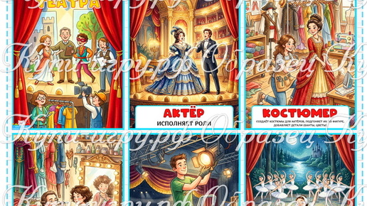 Профессии: актер, костюмер, режиссер, гример, бутафор, осветитель, декоратор,