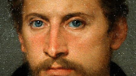 Один портрет привлек его внимание. Изображен был человек средних лет, весь в черном, с цепью на шее, с темными волосами