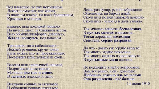 "На железной дороге" - стихотворение Александра Блока, написанное в 1908 году, является одним из наиболее известных и значимых произведений поэта. В этом стихотворении автор переносит нас в атмосферу трансформаций и перемен, которые сопровождают появление железной дороги в России. Строительство железной дороги во многом изменяло и переворачивало привычный уклад жизни в России. Блок в своем произведении рассматривает этот процесс через призму символического описания поезда, который становится метафорой для прошлого и будущего, для событий и эмоций, для силы и движения...