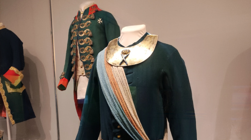 Кафтан подпоручика лейб-гвардии Семеновского полка Александра Федоровича Талызина со звездой ордена Святого апостола Андрея Первозванного и орденской лентой. В этот кафтан была одета императрица Екатерина ll в день дворцового переворота 28 июня 1762 г. Российская империя. 1750-е - 1760-е гг. Стамед, сукно, золотный галун, латунь, серебряные бить, канитель, пряденые нити, блестки, цветные шелковые нити, муар; ткачество. Мундир офицера лейб-гвардии Преображенского полка. Принадлежал императору Павлу l Российская империя...