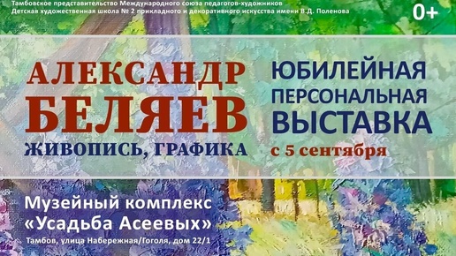 Талантливый и известный живописец порадует всех любителей искусства уникальной юбилейной выставкой, которая пройдет в Музейном комплексе «Усадьба Асеевых». Выставка продемонстрирует двадцать произведений графики и живописи, раскрывающих художественное восприятие мира автором. Александр Сергеевич Беляев является членом Международного союза педагогов-художников. Он получил образование в Тамбовском педучилище №2, а затем продолжил обучение на художественно-графическом факультете Курского педагогического института...