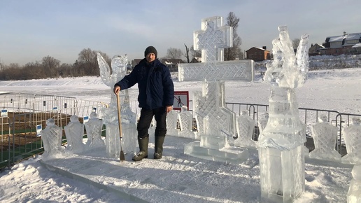 В Новый год мы рассказывали вам о мастере, который изготавливает ледяные фигуры. Благодаря ему для тех, кто решил окунуться в прорубь, праздник Крещения будет особенно красивым. Художник Александр Тихонов потрудился на берегу Ашкадара - оформил ледяными творениями природную купель...