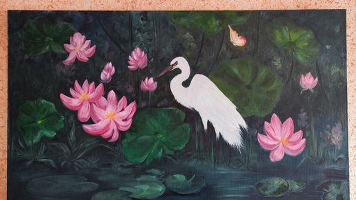 » Холст, 50*100 Цапля — это застывшая тишина. Она стоит среди лотосов, белая и безмолвная, а вокруг неё сплетается мир из воды, листьев и уходящих в глубину сумрачных зарослей. И в этой тишине — едва уловимый шепот: легкий взмах крыльев бабочки, мимолётный, как мысль, как золотая нить в тёмном воздухе...