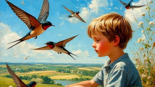 Жили-были в далёкой деревне две сестрички-ласточки — Лео и Мила. Летом, когда солнце уже достаточно прогрело землю , Лео и Мила вернулись из тёплых краёв домой. Они очень любили свою старую глиняную избушку под самой крышей деревенского дома. Там всегда было тепло, уютно и пахло цветами, которые росли в саду. Ласточки с радостью принялись чинить своё гнёздышко, укрепляли его соломинками и пушистым пухом. Однажды, когда Мила принесла для гнезда красивую золотистую травинку, она заметила в саду грустного мальчика...