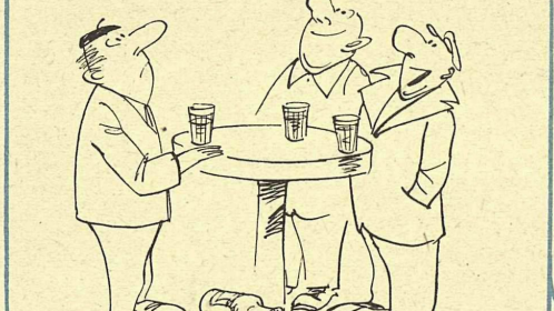 Привет, друзья! Главной профессией Александра Алешичева был цирк. И сегодня мы посмотрим рисунки человека, профессия которого очень видна в сюжетах его рисунков. Здесь всегда какая-то особая острота ситуации, что-то такое от настоящей комедии положений. Как-будто художник рисует не карикатуру, а режиссерский набросок к сценке. Вот, например, как тут. Согласитесь, это не просто повод для мгновенной улыбки, тут очевидна предыстория. Мужчина небрит, скорее всего, у него длительный запой. Пьет он один - желающих "сообразить на троих" не видно, даже стакан один...