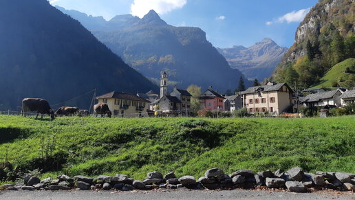 Махнув на прощанье рукой альпийской деревне Брионе, я села в автобус, за окном замелькали Швейцарские Альпы и луга. Через 15 минут автобус остановился на большой парковке. "Сононьо"- обьявил аудиоинформатор. Сононьо - конечная остановка, автобус и другой транспорт дальше не идут, дальше - только в горы на велосипеде, это я поняла, когда увидела чуть позже дорожные знаки на дороге. А пока- я выхожу из автобуса и вижу ну просто классическую картину альпийской деревни: луга, Альпы, колокольня и...
