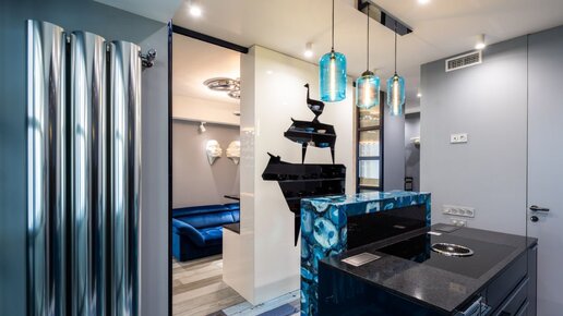 Квартира спроектирована для семьи из 5 человек. Супруги и 3 детей. Как ни удивительно, основной задачей было сделать детскую максимального размера. Важно, что комфорт не был принесен в жертву. Тут есть не только кухня гостиная, но и столовая, а так же 2 туалета. Работать над этой квартирой было огромным удовольствием. Редкий случай когда креативность заказчиков и архитекторов идеально сочетаются, приводит к дерзкому, яркому и необычному интерьеру. Начнем с одной из самых ярких частей- Перегородка разделяющая кухню и гостиную изначально была просто стеной...