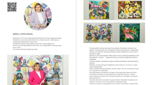 Инна Горбунова – родилась в 1970 году в Волгоградской области в хуторе донских казаков. Закончила педагогический институт по специальности живопись и декоративно прикладное искусство. Основатель школы современного искусства Артмосфера24. Член Союза абстракционистов России, член Евразийского Художественного Союза. Участник многочисленных выставок/ В своих работах автор использует различные объемные текстуры и медиумы, чтобы зритель мог в большей степени погрузиться в создаваемые образы, и мог ощутить непосредственную связь абстрактного искусства и реального мира...
