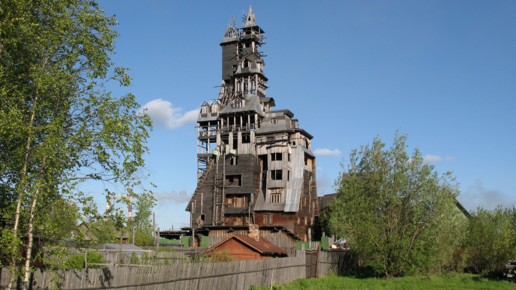 Человеческие странности и причуды всегда манят и притягивают взгляды. Деревянный небоскреб Н. Сутягина - причуда из причуд, архитектурный винегрет, абракадабра, фантасмагория, похожий на дом сказочного персонажа. Об этом доме писали мировые СМИ. Для многих он похож на аттракцион Дисней Парка, на пещеру страха. Такое творение врезается в твою память на веки вечные. Добро пожаловать в мой Деревянный Небоскреб! Деревянный небоскреб имел 13 этажей. Его построил Николай Сутягин в Соломбале (север Архангельска)...