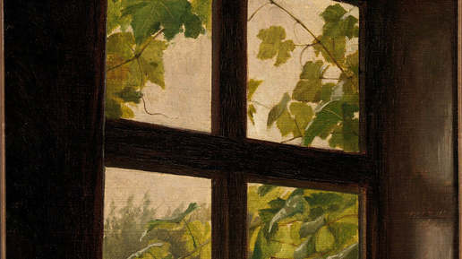 Вместо того чтобы открывать вид за окном, стёкла загорожены декоративным узором из листьев и усиков, цвет которых варьируется от ярко-зелёного до жёлтого, охристого и оливкового. Некоторые листья прижаты к стеклу, обнажая их тонкие белые прожилки. Чтобы добиться такого эффекта, немецкий художник Антон Генрих Диффенбах (1831–1914) использовал кончик своей кисти, дабы процарапать влажную краску до белой основы. Высокая изгородь за виноградными лозами образует тёмный фон для лиственного узора на нижних стеклах, тогда как на верхних они очерчены на фоне бледного неба...