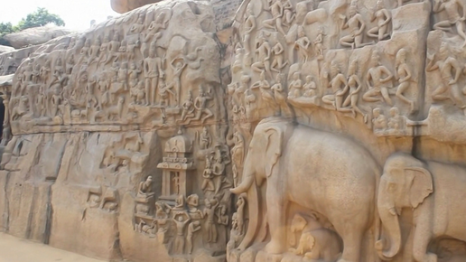 Мы находимся в Махабалипураме в Индии, и я собираюсь показать вам второй по величине в мире барельеф под названием "Покаяние Арджуны", вырезанный 1300 лет назад. Этот рельеф имеет около 96 футов в длину и 43 фута в высоту. Это очень интригующе, потому что резьба, кажется, доказывает древние теории астронавтов и рептилий, меняющих облик в наше время. Согласно теории рептилий, рептилии - это инопланетяне, меняющие форму, которые живут под землей и способны летать и превращаться в людей. Похоже, какой-то...