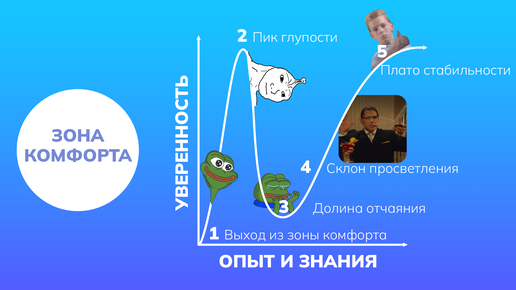 Давайте поговорим о том, почему так происходит и как не бросать начатое, а также расширить свою зону комфорта. Я подготовил для вас график, основанный на графике эффекта Данининга-Крюгера, который вы найдете наверху.