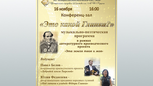 В тверской библиотеке имени Герцена в рамках краеведческого проекта «Эта земля твоя и моя» состоится музыкально-поэтическая программа «Это какой Глинка?» Фёдор Николаевич Глинка – русский поэт, патриот, декабрист и герой 1812 года, «открыватель тайн старинных, добродей земли Тверской». Гости мероприятия получат сведения о Фёдоре Глинке и его жене Авдотье Павловне, в девичестве Голенищевой-Кутузовой, о бывшем имении Голенищевых-Кутузовых и Ф.Н. Глинки. На вечере прозвучат романсы на стихи Фёдора Николаевича в исполнении дуэта «Поэма»...