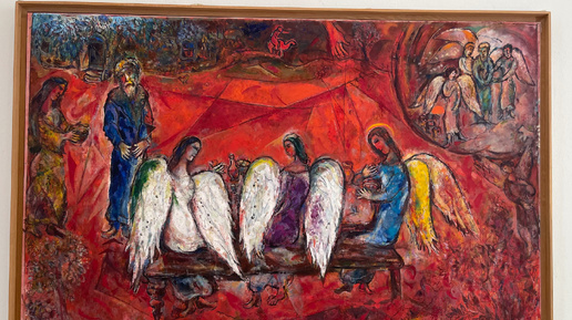 «Авраам и три ангела» 1960–1966 Холст, масло Три ангела, божественных посланника, пришли возвестить о скором рождении сына у престарелых Авраама и Сары. Шагал выделяет трёх ангелов, которым Авраам оказывает гостеприимство. Композицию структурирует горизонтальная линия скамьи на переднем плане, прерываемая рядом вертикалей. Главный цвет картины — красный, цвет жизни и любви...