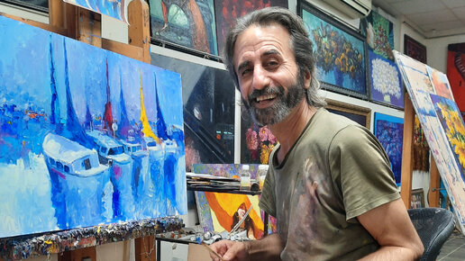 Друзья, вы когда-нибудь были в месте, где картины создаются в режиме "без выходных и перерывов"? Настоящим художником с настоящими масляными красками? Я в таком месте работаю, и точно знаю, что множество людей хотят здесь побывать хотя бы виртуально. Начнем с художника. Знакомьтесь, Байрам Саламов. Его имя можно перевести с тюркского языка как "Здравствуй, праздник", - отсюда и название канала) Журналисты очень любят обыгрывать его в названиях своих статей - "Человек-праздник", "Фестивал-мэн" и пр...