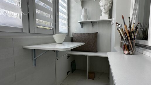 Иногда достаточно заглянуть на свой балкон новым взглядом, чтобы понять: перед вами не узкий коридор, а будущая мини‑студия, в которой рождаются картины, скетчи и смелые идеи. Белоснежное пространство с аккуратными столешницами и гипсовыми головами на полках сразу настраивает на рабочий лад и создает ощущение настоящей профессиональной мастерской.​ Светлый балкон это идеальная сцена, где главную роль играет ваше творчество, а не отделка. Белые стены, потолок под светлое дерево и крупная плитка под мрамор делают помещение воздушным и чистым, словно лист ватмана до первого мазка кисти...
