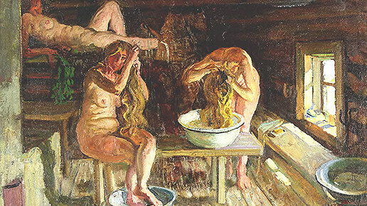На их полотнах можно увидеть традиционные парные, сцены с берёзовыми вениками и атмосферу отдыха после парения...