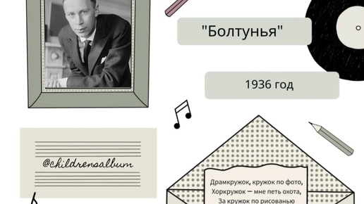 Признавайтесь, кто уже успел сходить на родительское собрание и начал жонглировать кружками и секциями, пытаясь составить удобное расписание? Сегодняшняя песня для вас! В 1930-х годах Сергей Прокофьев сочиняет цикл детских песен на стихи известных поэтов. Подробнее об этом на сайте: https://www.childrensalbum.ru/tri-detskih-pesni-prokofev/ Открывает цикл шуточная миниатюра "Болтунья" на стихи Агнии Барто про увлеченную школьницу Лиду, которая выбирает себе секцию по душе: Драмкружок, кружок по фото, Хоркружок — мне петь охота...