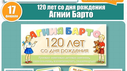 17 февраля 2026 года исполняется 120 лет со дня рождения Агнии Львовны Барто (1906–1981) — русской детской поэтессы. В рамках празднования в некоторых библиотеках запланированы мероприятия, посвящённые творчеству Барто. В комплект входят: 3...