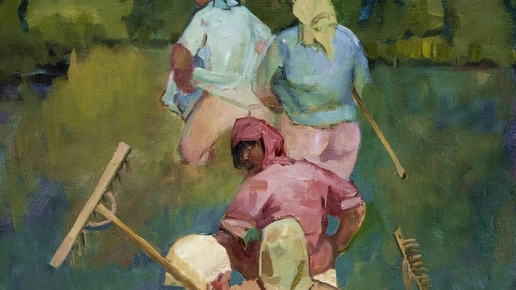 Художник смеется, изображая сюжет, который увидел, наверное, еще в детстве, а к старости припомнил. Улыбаемся и мы. Здоровые женщины, красивые крепкие у них попки. Идут чуть ли не строем, в ряд друг за другом, что добавляет комизма...