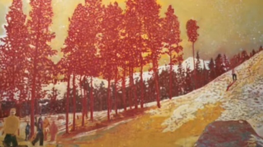 Питер Дойг ещё один, называемый метамодернистом. А стиль тот, вроде, к оптимизму имеет отношение, раз тянет автора к натуре. Я даже подумал было, что так и есть: стесняется натуры, как бы закрывает её. Городок такой в Англии. Но. Таких схематических ёлочек (на фоне пруда), как на первой картине, не бывает. Во второй картине снежинки могут падать на землю и не образовывать снежного покрова (тут же таять). Однако они не могут, летя, выстраиваться в полосы (три полосы можно узреть, если внимательно смотреть)...