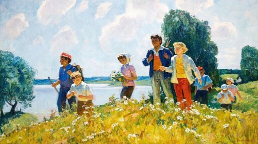Соцреализм в стране советов пронизывал все сферы культуры. Особенно наглядно он внедрился в изобразительное искусство. Я, хоть и имею художественное образование, но не помню ни одной картины про пионеров. В основном в своём пионерском детстве видела только агитку: плакаты, растяжки с лозунгами. Да ещё на аллеях наших пионерских лагерей - длинные ряды портретов пионеров-героев. А сегодня смотрю в интернете - оказывается много произведений живописи на тему пионерии было создано художниками советского времени...