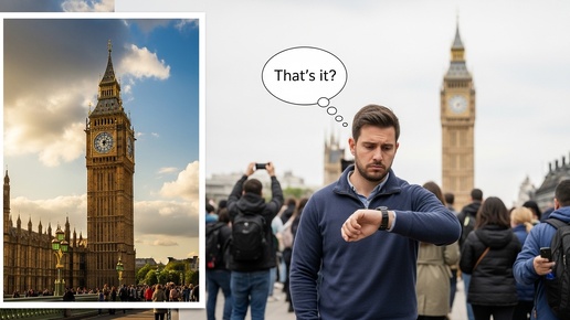 Приехала в Лондон. Биг-Бен в списке обязательных. Икона Великобритании. Символ на всех открытках. Представляла: подойду, увижу величественную башню, почувствую дух Лондона, проведу там час минимум. Выхожу из метро Westminster. Вижу башню. Большая. Красивая. Часы. Фото сделала. Смотрю дальше. Стою пять минут. И думаю: всё? Это всё? Башня с часами. Красиво, но что ещё? Подойти близко нельзя. Внутрь не попасть. Просто смотришь издалека на часовую башню. Сфотографировала. Всё. Пошла дальше. Потратила на Биг-Бен ровно 5 минут...