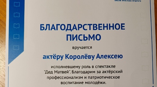 Сегодня нашему театру "Елена Есенина" и всему актерскому составу было вручено благодарственное письмо от Политехнического колледжа за наш последний спектакль "Дед Матвей". Это было неожиданное, но приятное событие для нас. Руководитель театра, Елена Есенина, получила это почетное признание за нашу работу и творческий подход к постановке спектакля. Мы очень рады и гордимся этим признанием, которое стало возможным благодаря нашей команде и нашему таланту.