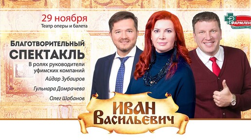 29 ноября 2018 года в Уфе на сцене Башкирского государственного театра оперы и балета (ул. Ленина, 5/1) состоится благотворительный спектакль. Предприниматели и руководители уфимских компаний выйдут на сцену, чтобы помочь реализовать мечты талантливых детей из малообеспеченных семей Уфы. В этом году зрители увидят комедию в оригинальной режиссерской постановке по мотивам произведения Михаила Булгакова «Иван Васильевич». Это уже третий благотворительный спектакль в Уфе, проводимый в рамках федерального проекта «ЗнаменитостиДетям»...