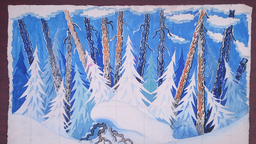 Зимний лес в эскизах к Ёлкам в различных ДК Свердловска. Художники Блиновы Н. А. и Н. Ф.