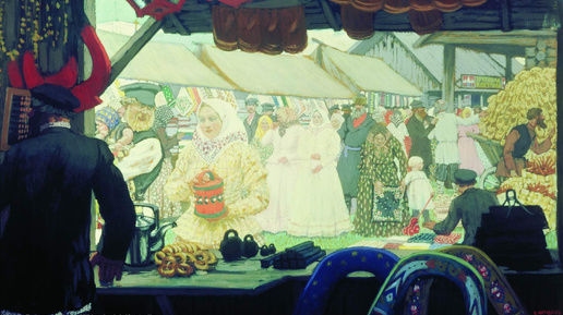 Мы узнаём работы Бориса Кустодиева с первого взгляда по красочности его ярмарок. К этому сюжету в своем творчестве художник обращался множество раз и признавал, что исчерпать эту тему вряд ли возможно: сегодня здесь базар, именно то, для чего я сюда ехал, да базар такой, что я как обалделый (извини за такое выражение, не особенно красивое, но верное) только стоял да смотрел, желая обладать сверхчеловеческою способностью все это запечатлеть и запомнить и передать. Положительно глаза разбежались. Столько...